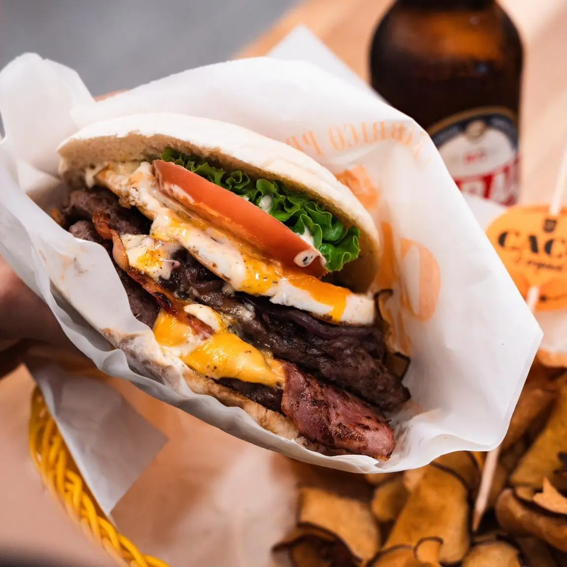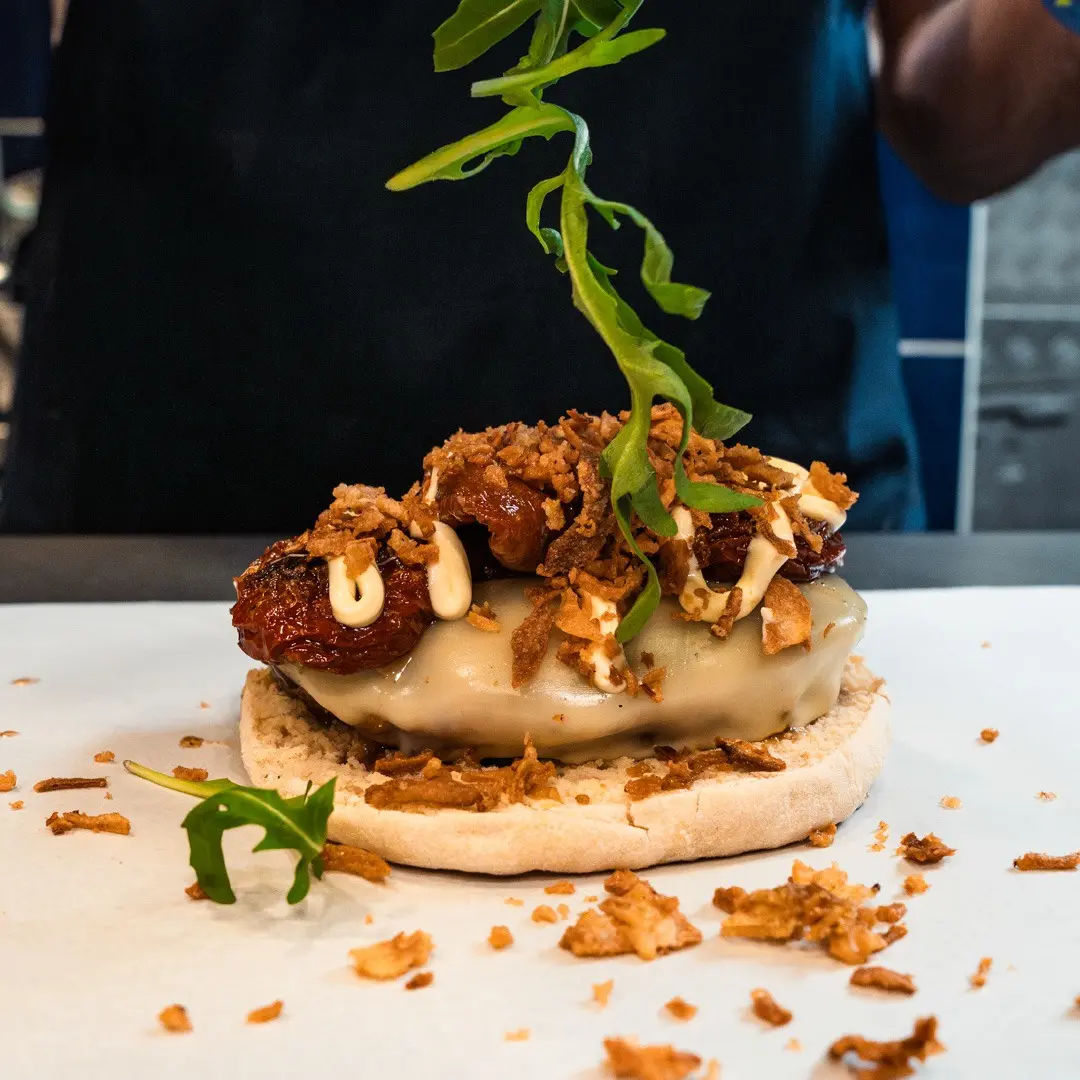 Hambúrguer vegetariano e sanduíches personalizadas com ingredientes à escolha.